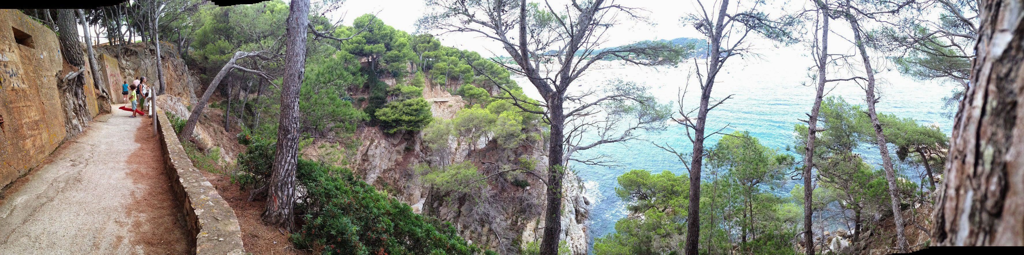 Justo al salir del camping hay un área que sirve de parking bajo pinos y bordeado de encinas, y al costado del mismo se puede ver un campo de siembra. Ahí comienza el recorrido por un sendero en dirección al mar: aproximadamente 25 minutos a paso de niño distraído. La mayor parte del recorrido está bajo la sombra de los árboles, con vista al bosque de encinas y compartiendo el camino con bicicletas (parte del trayecto es usado por los que hacen la Vía verde Ruta del Tren Petit Palamos-Palafruguell). No hay complicaciones en este camino. Un primer cruce indica un atajo a la playa a través de la zona de aparcamiento, pero yo lo evitaría en horas de mucho sol, por la falta de sombra. Por cierto, el parking es de pago.