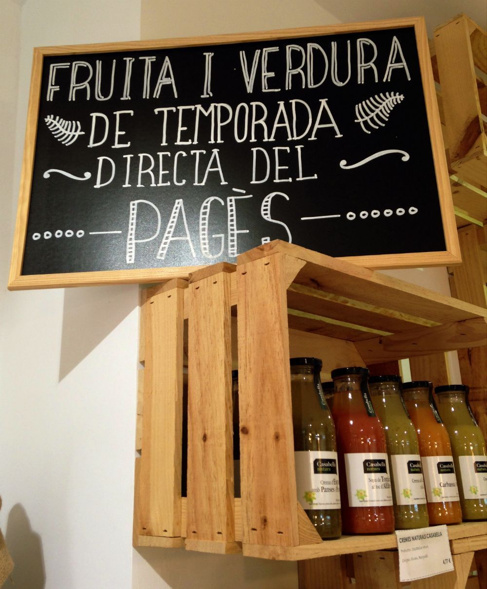 Es un sitio que invita a entrar. Saltan a la vista las frutas y hortalizas frescas en cajas de madera, las conservas, los cereales y las legumbres a granel. Llama la atención también lo luminoso y blanco del local. Pero sobre todo, salta al corazón el nombre: Autòctons. Y un mural que se puede ver desde el exterior: Aquí encontraréis alimentos de la tierra, directo del productor, artesanos… Es decir, productos de proximidad o, como se dice ahora, productos km 0.