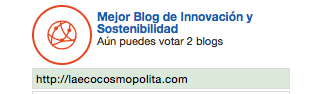 Hacer en este enlace de Premios Bitácoras.Escoger una de las tres opciones siguientes: votar con una cuenta de Bitácoras, de Twitter o de Facebook (con las redes sociales es un par de clics y ellos no publicarán en tu nombre). De inmediato estarás en la hoja de votación y La Ecocosmopolita aparecerá automáticamente en la categoría de Innovación y Sostenibilidad.