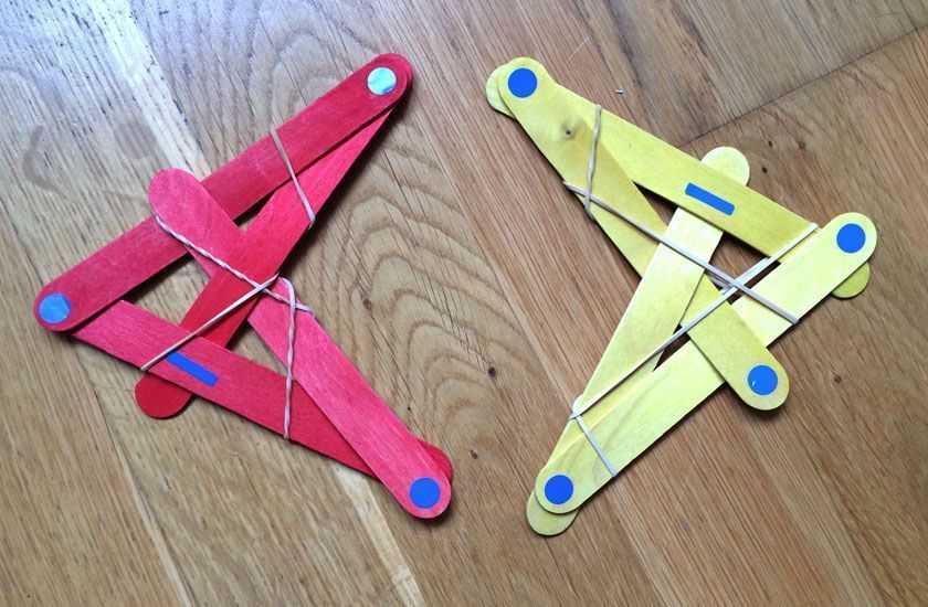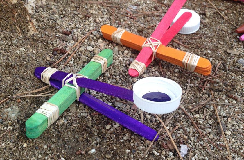 • Estrellas o “bombas” para lanzar: se hacen con palitos de helado de madera. La idea es que se lanzan y al chocar con una superficie dura, se desarman. Es verdad que no funcionan muy bien sobre arena y que luego hay que enseñarle a los padres a armarlas de nuevo para lanzar. Los mismos palitos pueden usarse para muchas cosas en casa.