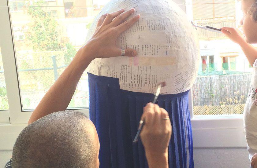 La piñata en sí no es tan complicada de hacer. Aunque pueden ser muy elaboradas, (una amiga hace unas preciosas) nosotros optamos por una versión sencilla, que no representara nada en particular. Con un globo (sí, es plástico, lo sé. Si volvemos hacer piñata la haremos sin el globo), engrudo (harina, agua y cola blanca) y papel de diario o del que tengas en casa (usamos papel reciclado que teníamos para imprimir ya usado por los dos lados) y con la ayuda de G la fuimos haciendo en varias etapas.
