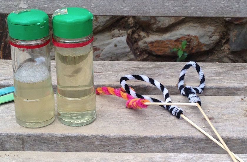 • Palitos para hacer burbujas hechos en casa con palillos de madera y limpiacañitas. El jabón lo preparé en casa y lo metí en botes de especies de cristal que tenía en casa y otros que me donaron, pero si el cumpleaños es en verano o primavera, puedes poner un cubo grande o palangana con la mezcla de jabón.