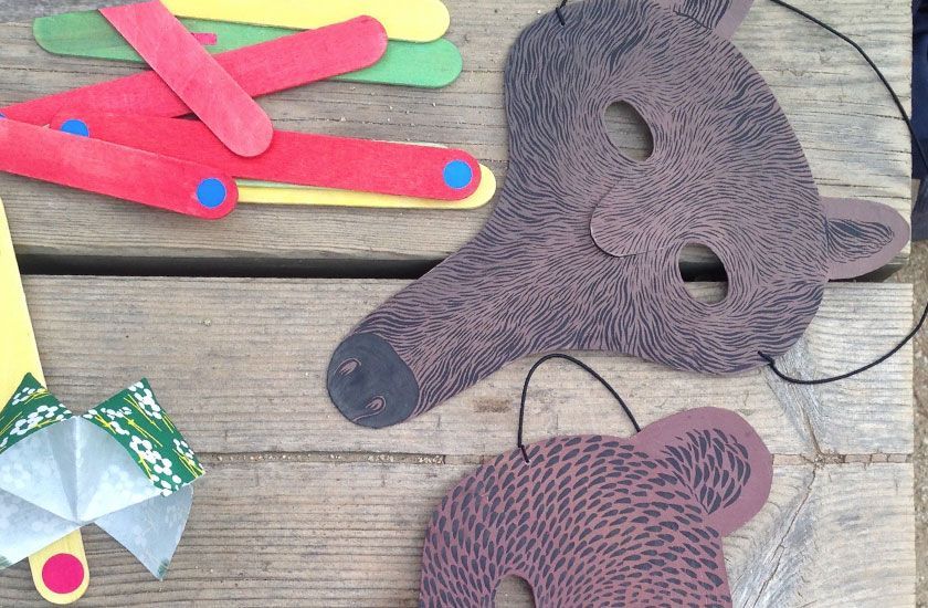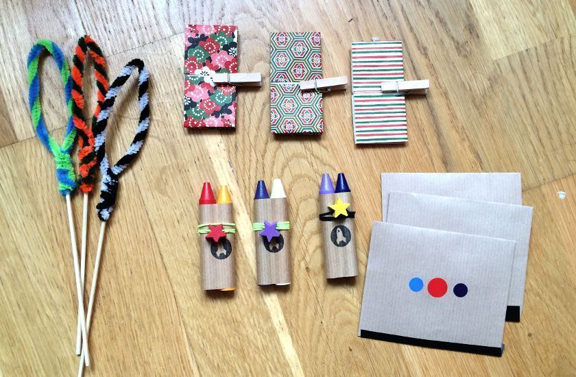 • Pulseras y collares hechos en casa (yo hice unas con la misma elástica de las máscaras y figuras de ensartar de un juego que tenía G). Estas pulseras me sirvieron para juntar las ceras de colores y los rotuladores en pares.
