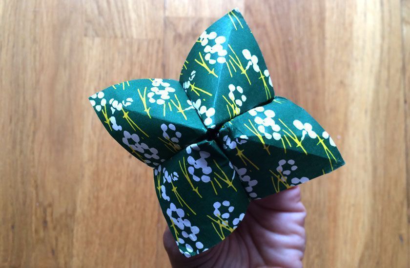 • Plegados con papel como comecocos, hechos con papel de origami que tenía en casa, cogidos con una pinza de madera.